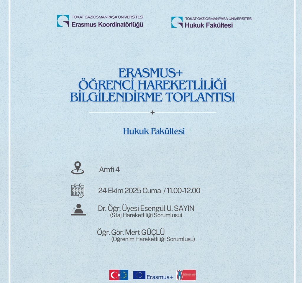 Erasmus Koordinatörlüğü tarafından 24 Ekim 2025 Cuma günü 11:00-12:00 saatleri arasında Fakültemiz Amfi-4'te Erasmus Bilgilendirme Toplantısı yapılacaktır.