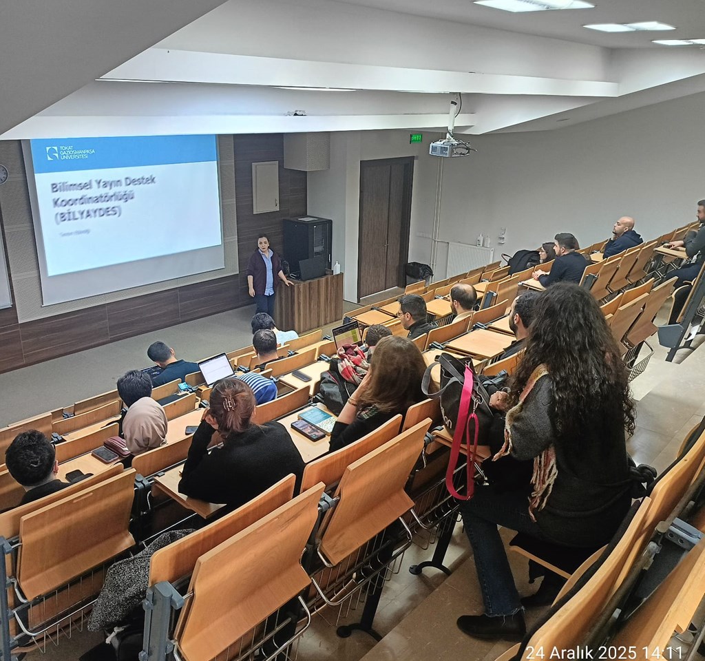 24 Aralık 2025 Çarşamba günü Saat:14.00'da D-206 nolu derslikte Bilimsel Yayın Destek Koordinatörü Öğr. Gör. Sibel CANDAR'ın katılımıyla Akademik Araştırmada Bilgiye Erişim: Literatür Taramada Elektronik Kaynak Kullanımı Eğitimi Gerçekleştirildi.